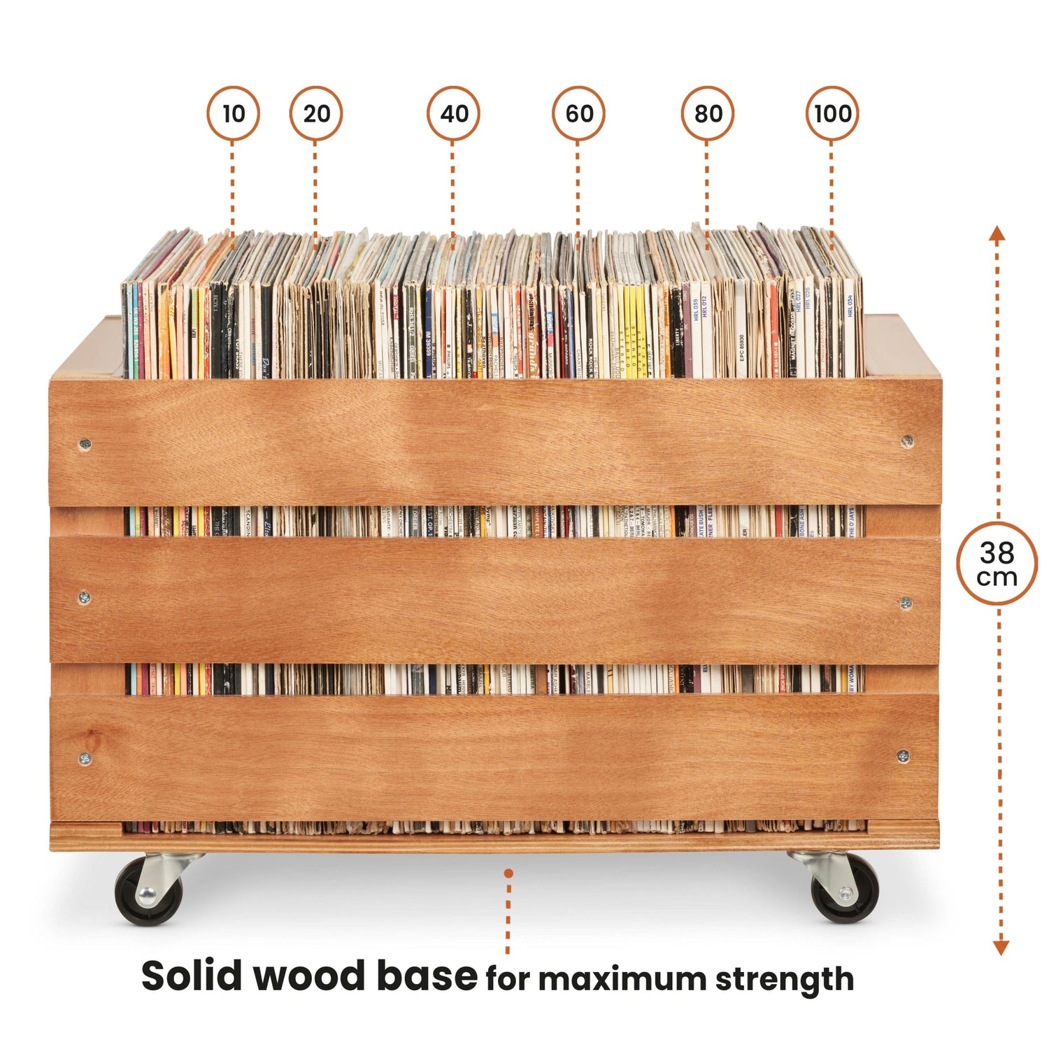 GREAT CAPACITY: Holds up to 100 single and double albums, even when protected with plastic sleeves. This is the perfect record holder to store larger collections, whilst at the same time having them close to hand and easy to browse. We have made this record storage box bigger than most similar LP storage boxes, to give you space to keep even more.