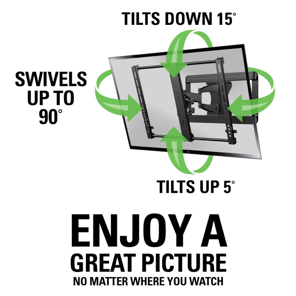 The VMF620 full-motion+ mount lets you enjoy a great picture no matter where you watch. Tilt, swivel, extend and level your TV without the need for tools.